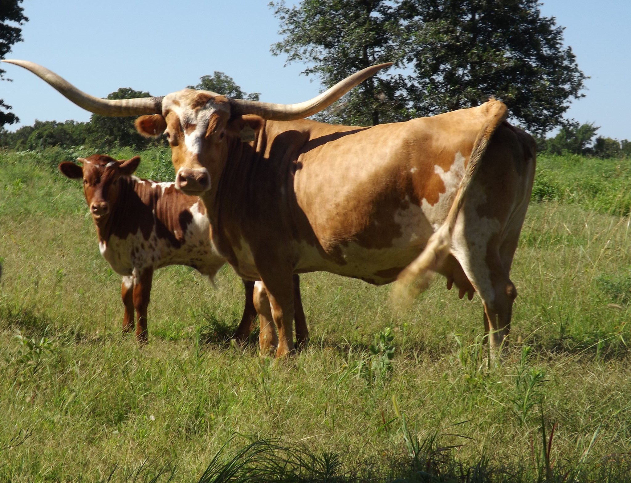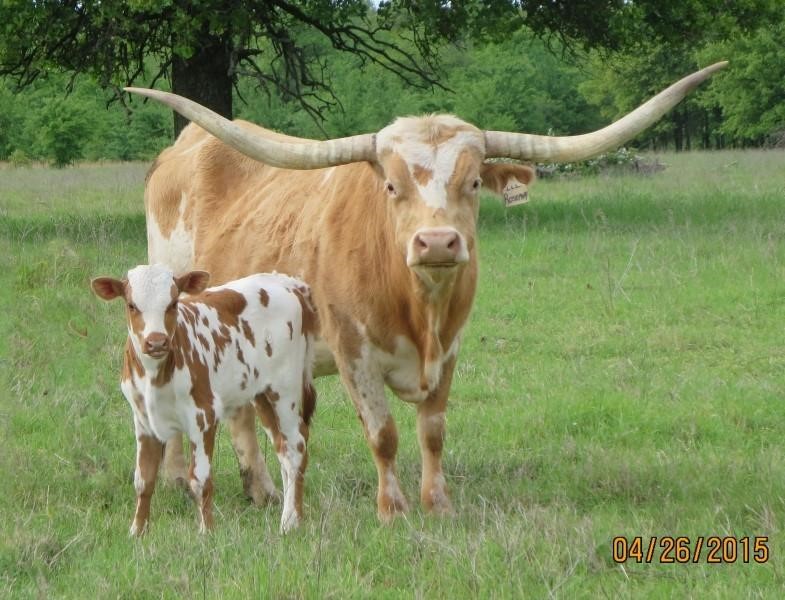 This is one of our best cows!!! She is currently over 80" total horn. She produced HR Slam's Rose, HR Rosebud, Big Red HR, Rowdy HR and many others....bull or heifer, makes no difference, they are winners. Confirmed pregnant to RHF Sharp Shooter for a May 2022 calf.